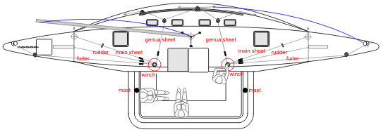 Der Baum wird nahe am Großstag angebracht und ist mit einem Baumniederholer ausgestattet. Die Genuaschot(en) wird auf einer Schiene auf dem Kajütdach angeschlagen. Alle Schoten werden auf zwei zentralen Winschen bedient. Die beiden Vorsegel sind als Rollsegel ausgeführt. Bei jedem Shuntvorgang wird das aktive Vorsegel eingerollt, der Baum freigegeben und auf die neue Seite geführt, dann das neue Vorsegel ausgerollt.