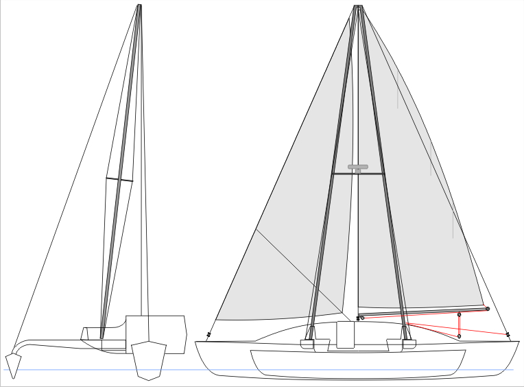 Vorgesehene Segelfläche Genua 27,5 m² und Großssegel 27,5 m². Bei einem angestrebten Reisegewicht von 2,4 Tonnen entspricht das einer Segeltragezahl von ca. 23 qm/t.