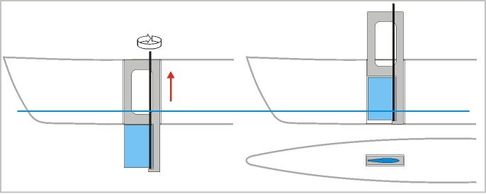 Das Thema Ruderanlage wird auf "traditionelle" Art mit zwei absenkbaren Steckrudern mit Skeg in den Bügen gelöst. Das Absenken/Aufholen beider Ruder, wie auch des Schwertes im Ama, sind vom Cockpit aus zu bedienen. Die Steuerung erfolgt mit Pinnen oder, wie geplant, über Bowdenzüge zu einer Steuereinheit. Der Skipper wechselt je nach Fahrtrichtung den Platz.