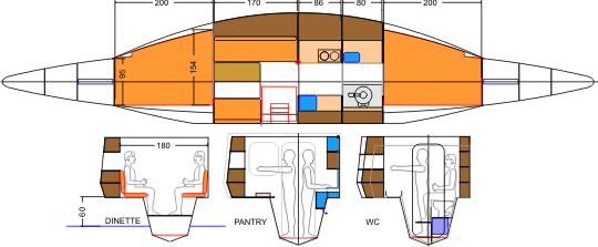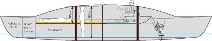 Für den Innenraum eines Fahrtenbootes ist der Mensch das Maß aller Dinge. Eine Größenordung bei der zwei Personen noch bequem aneinander vorbeigehen können, bedingt eine Fußbodenbreite von ca. 80 cm. Will man das Streckungsverhältnis nicht unterschreiten, ergibt sich zwangsläufig die Bootslänge von ca. 12 m mit einer Länge in der Wasserlinie von 11 m.