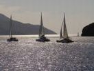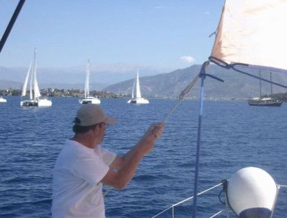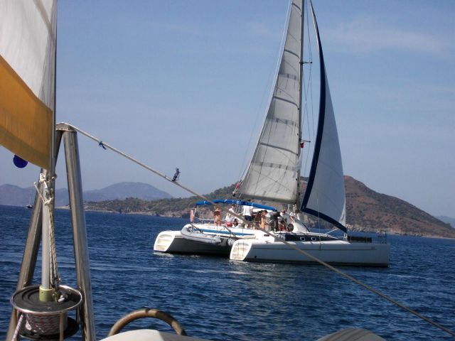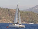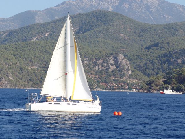 Der Donnerstag beginnt mit einem türkischen Frühstück im Freien vor dem Hotel Mediteran, an das sich die letzte Skipperbesprechung anschließt. Die mittlererweile gutbekannte Untiefentonne vor der Buchteinfahrt sowie unsere „Father Murphy" markieren die Start- und Ziellinie. Aus der guten Erfahrung des Vortages mit den kurzen Regattabahnen wird kurzerhand beschlossen, noch einmal etwas ähnliches durchzuziehen. Also wieder zwei Wettfahrten, diesmal muss eine schnell ausgelegte Boje nördlich der roten Insel umrundet werden.