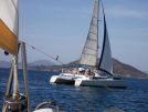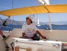 Doch vorher heißt es in der angrenzenden Bucht „Baden" und auf Wind warten, der sich heute ganz ungewohnt etwas verspätet. An Bord der „Mupfel" wird daher erst einmal Spaghetti ala pepperonata gekocht. Das kurze Tuten des Starthorns, das noch 10 Minuten verspricht, reicht um die Nudeln abzugießen und zu servieren und das zweimalige Tuten für 5 Minuten reicht noch zum Abwasch. Das war der einzige zeitliche Stress der letzten Tage. Kaum ist der letzte Teller im Regal, heißt es Anker auf, Segel setzen und wiedereinmal rauschen wir mit dem Startton über die Linie. Diesmal aber in respektvollem Abstand von „Father Murphy's" langem Spargel. Es ist durchaus ein gutes Gefühl ein einmal Regattafeld anzuführen, wenn auch nur für kurze Zeit. Natürlich ist in erster Linie die kaputte Genua Schuld an der zu geringen Geschwindigkeit. Das neue Ersatzsegel benötigt einen Holepunkt irgendwo einen Meter über Deck und so wird mit vollem „Gewichts-„Einsatz für den notwendige Trimm des Achterlieks gesorgt.