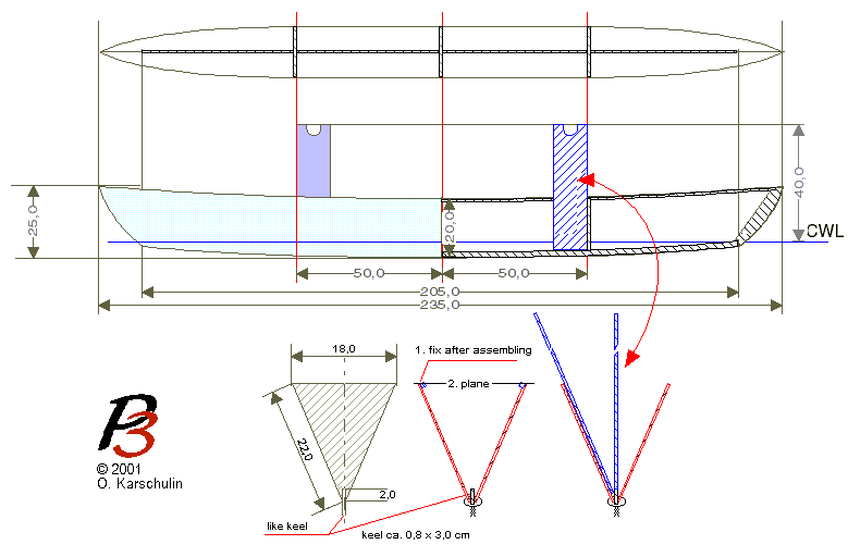 In the following I offer a few drawings for all interested people which are crazy enough to build such a boat to take part in the 10' class regattas. Be shure that nothing is perfect and all measurements will be handled with care. In every case a lot of creativity in detail are required - please have a look at the comments at the end of the page (click on thumbnail to enlarge plans):