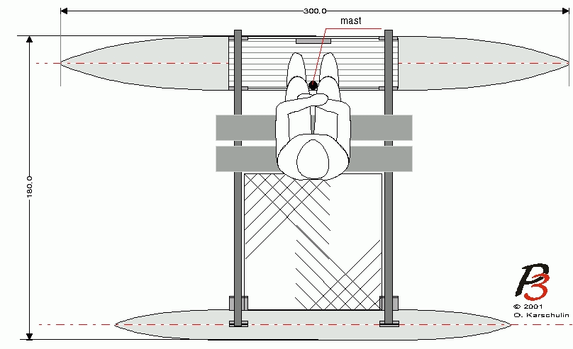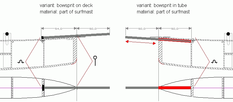 The sail area with about 6,0 square meter corresponds nearly to 8-9 sqm of a classic bermuda rig. The Crab Claw is running on a rail which is fixed on both bow sprits and the beams. Alternative a Dierking/Gibbons rig is possible in the same way it is used at my 5m design P5. The Crab Claw may have advantages in wind beam reach, the Gibbons may be better close to the wind and have an easier handling during shunting. For all beginners: animated example of shunting.
