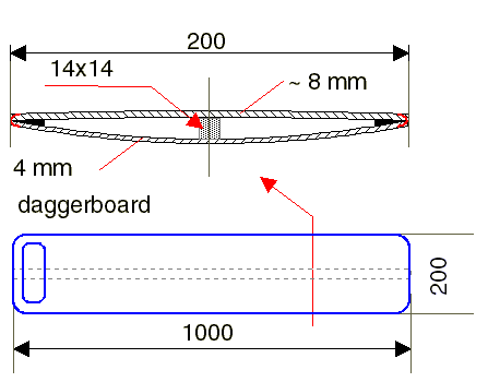 - The daggerboard is build from plywood (see drawing). Use a thicker and a thinner plate and you will get an assymmetric profile. The more flat side shows to lee.