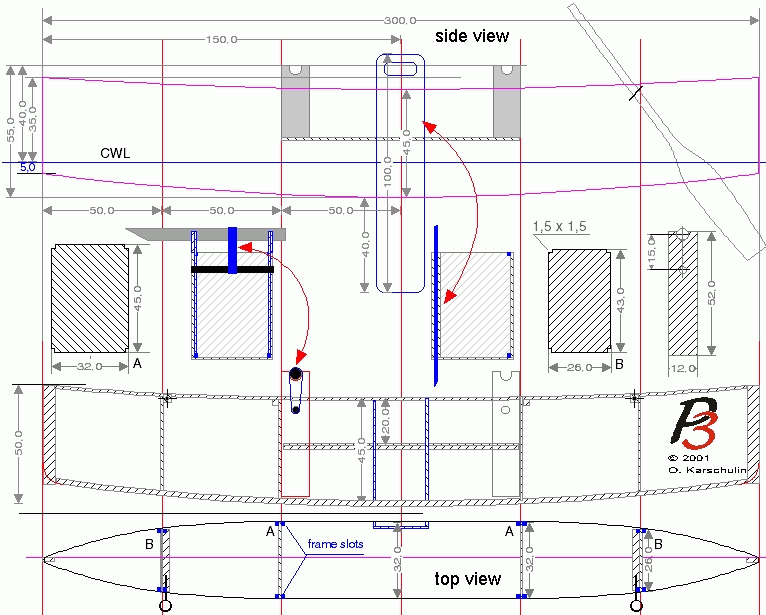- Glue the stringer on the upper and below edges of the hull sides, also build slots with small battens (1,5x1,5) to put the frames in. For gluing buy a starter kit of West Systems, SPS or annother company.