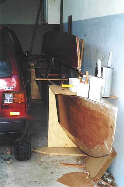 Ansonsten ist der Bau ohne größere Probleme verlaufen, wenn man mal bedenkt, dass ich so etwas nicht jeden Tag mache. Als Sperrholz habe ich Okoume verwandt, in 5mm, weil 4mm hier nicht zu bekommen war. Das war mir auch ganz recht, weil ich mit dem Boot auch auf die Ostsee will, und so alles etwas stabiler sein darf. Wie Du schon angeregt hattest, hat das Boot zwei Balkenweger und zwei Stringer in 20X20 Kiefer. Da ich auch den Kiel aus den gleichen Leisten gebaut habe, hatte ich im Gegensatz zu Dir nicht das Problem, dass der vernähte Rumpf sehr instabil ist, sondern es war im Gegenteil schwierig, die Seitenteile zu biegen. Herzlichen Dank an dieser Stelle für Deine Konstruktionszeichnungen und die Bauanweisungen, ohne die ich den Bau sicher nicht hinbekommen hätte.