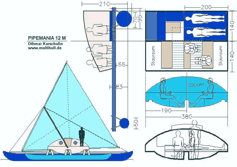 Wie die Geschichte zeigt, kann unter Verzeicht auf das Bewohnen des Rumpfes ein völlig anderes Segelerlebnis stattfinden. Wer mehr Platz benötigt, muß nur das Konzept vergrößern. Mit wachsendem Durchmesser steigt auch die Stabilität des Rohres bei relativ geringerem Zuwachs der Wandstärke. D.h. je größer die PIPEMANIA desto besser das Gewichtsverhältnis.