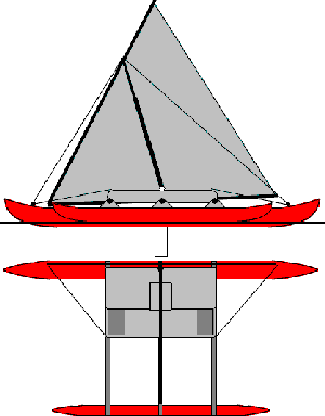 Auch wenn Schätzungen (wie immer) meist zu niedrig liegen, ist es doch erstaunlich mit welch relativ geringem Aufwand eine 10m lange (Fahrten-) Proa auf díe Rümpfe zu stellen ist. Der nächste Schritt ist die Vergrößerung auf 12-13 m, um eine schon brauchbare "Wohnqualität" in der Kabine zu erreichen (siehe Grafik unten). Die Krönung des Ganzen wäre eine mittige Demontage des Hauptrumpfes in zwei Transport-Teile, so daß die Ama-Länge von z.B. 6 m die Trailerlänge für eine 12 m Proa ist!