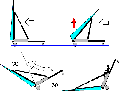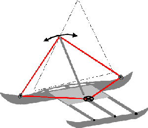 Damit ist PIPEMANIA aber noch nicht am Ende. Schließlich soll ja auch gesegelt werden. Also kurz die Segelfäche kalkuliert: Verdrängung 0,7 t ergibt bei gewünschten 30qm/t ca. 20 qm Segelfäche. Damit ist das Boot vielleicht etwas untertakelt, dafür kann aber auch bei mehr Wind gepowert werden. Zudem liegt mit seinem gleichschenkligen Deltasegel der Segeldruckpunkt nur etwa 3 m über dem Wasser. Und wem es nicht recht, der nimmt sich halt 10 qm mehr. Damit das auch alles klappt, wird das ganze Rigg flexibel gehalten und kann quer zum Boot sowohl nach Lee als auch nach Luv gekippt werden. Die ganze Mechanik steckt im luvseitigen Stützmast, der als Teleskoprohr ausgeführt wird.