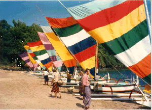 Die Jukungs werden heute noch hergestellt wie vor zichtausend Jahren. Mit viel Sorgfalt und unendlicher Geduld werden die Bäume, die natürlich gewachsenen Äste der Auslegerarme und schließlich die Bambus ausgesucht. Der einzige Kompromiß an die Moderne sind die Nylonseile mit denen die Auslegerarme und Bambus am Rumpf befestigt werden.