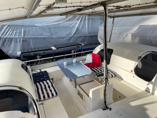 Zwischen den Rümpfen Stehhöhe unter dem Solar-Dach und Platz für Tisch mit Sitzplätzen für 8 Personen