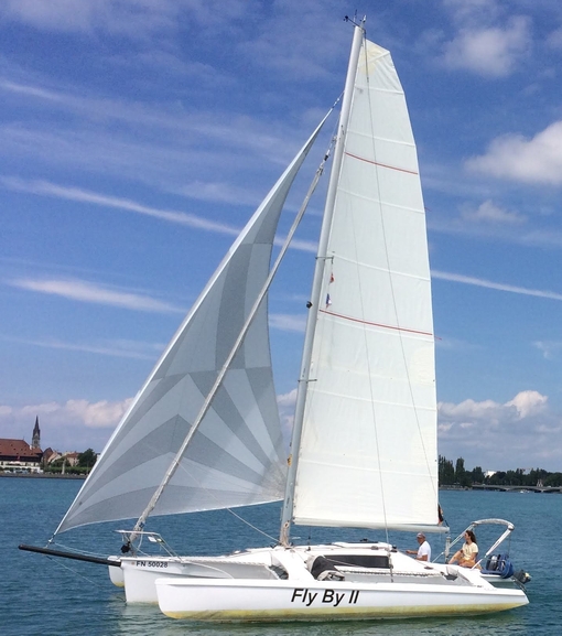 Stabil, schnell und leicht segelnder Daysailer von Virus-Boats Fr, Bj. 2006 (neues Modell mit vereinfachtem Trailern ohne Demontage der Schwimmer), einfaches Slippen durch Knicktrailer. Umfangreiche Ausrüstung für Touren, auch einhand. Gennaker wie neu, Segel gut.