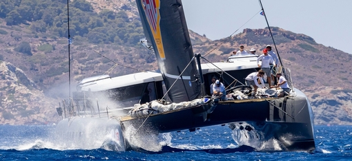 Adrian Kellers 86 Fuss Katamaran "Allegra" gewinnt das 5. Aegean 600 vor Aldo Fumagalli's Rapido 53XS "Picomole".