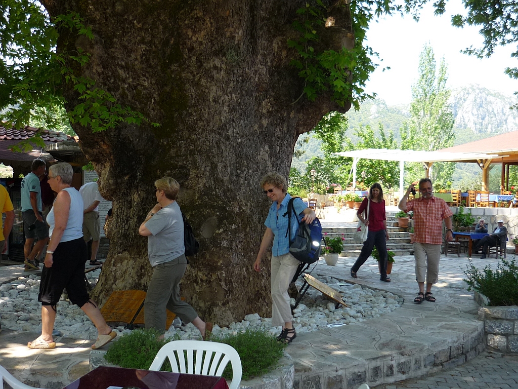 Ein glücklicher Zufall wollte es, daß dort gerade ein Landsmann sein traditionelles Boot herrichten ließ und allen Rede und Antwort stand. Weiter ging die Fahrt in das Hinterland zum Dörfchen Bayir, das von seiner uralten Platane lebt, die den ganzen Dorfplatz beschirmt. Der Hinweis, daß eine dreimalige Umrundung des Baum- veteranen Wünsche erfüllen hilft, ließ sogleich alle zum Reigen antreten. |