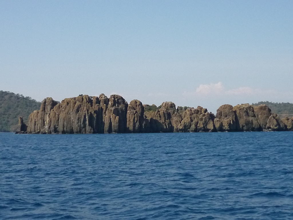 Aufgrund der Erfahrungen mit dem spät auffrischen Wind wurde erst um 11:00 Uhr gestartet. Und so stellte sich auch bald eine leichte Brise ein, die das Regattafeld quer über den Golf von Hisarönü brachte. Vor der Bencik- Bucht mußten die roten Felsen von Dislice gerundet werden. Weiter ging es um die Inseln Koca und Kameriye in die Einfahrt zur Bucht von Selimiye. |