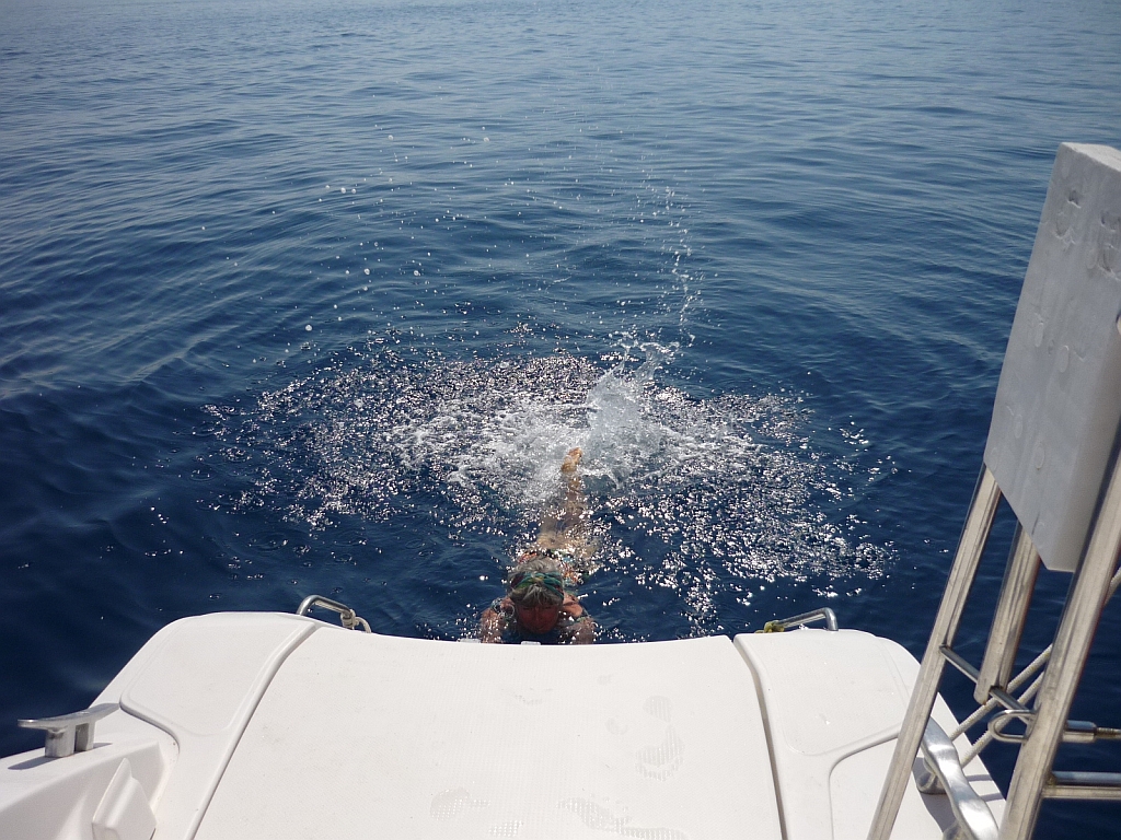 Einzig die Outremer "Come Beck" konnte mit der leichten Morgenbrise vor der Flaute davonsegeln und kam mit über einer Stunde Vorsprung ins Ziel. Der Rest der Flotte sammelte sich dümpelnd bei der Untiefenmarke vor Kap Atabol. Aber kaum waren die ersten Gedanken an einen Abbruch aufgekommen, besann sich der Wind doch noch und alle Boote kamen unter Segel nach Dirsek. Dort gab es die ersten Sprünge ins Wasser, das schon brauchbare Temperaturen aufwies. |