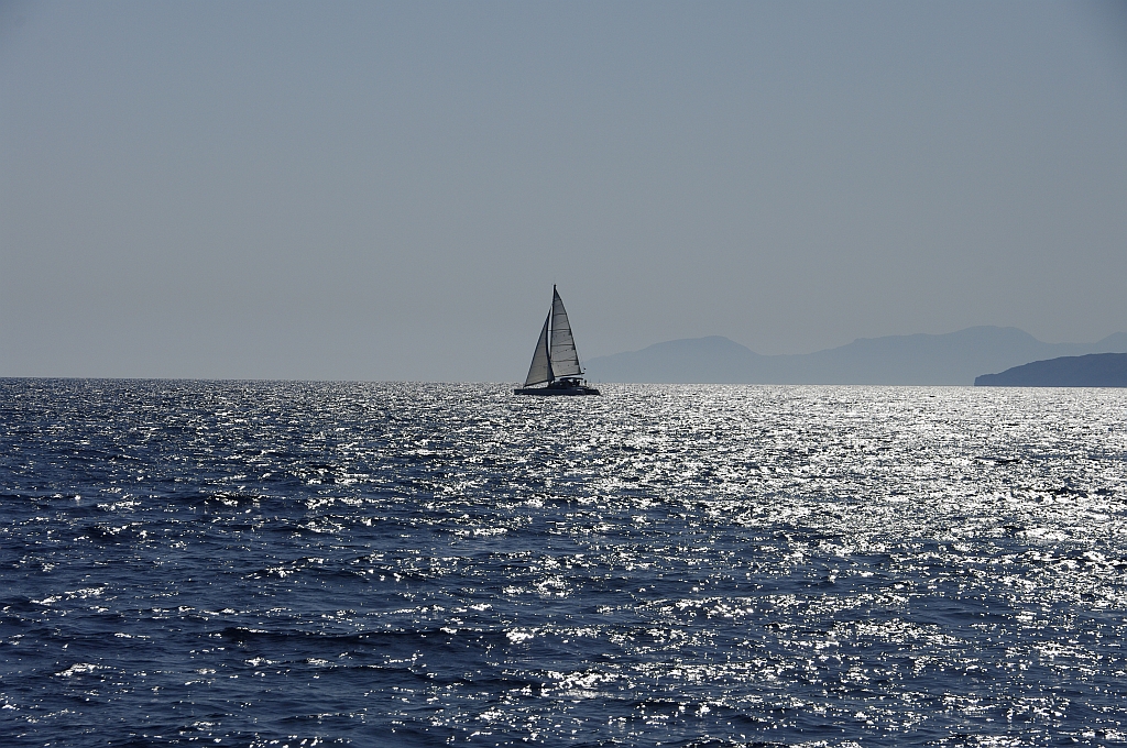 Da der Wind gemeinerweise auf Südwest gedreht hat, steht uns wieder ein Leichtwind-Kreuzkurs bevor. Eingedenk der Parksituation an der Untiefe machen viele einen weiten Schlag bis fast nach Symi, während andere ihr Heil unter Land suchen. Am Nachmittag ist das Feld weit auseinandergezogen, als der Wind sich wieder zur Ruhe begibt. |