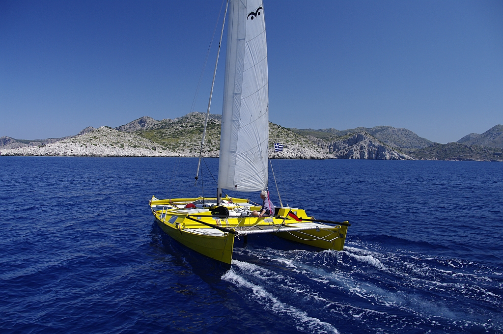 Ein anderer Wharram-Katamaran mit unserem Freund Lex besuchte ebenfalls die Sailing Week. Er setzte mit seiner Tiki 28 einen gelben Farbklecks zwischen die weißen Boote. Auch ihn verabschiedeten wir später in Dirsek und wünschten ihm Mast- und Schotbruch für seinen weiteren Weg nach Griechenland. |