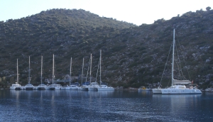 Der Seegang war aber noch erträglich und so konnten die 8 Katamarane mit Rauschefahrt Kurs Dirsek gehen, unserem nächsten Ziel. Auf dieser Strecke war sicher kein Skipper dabei, der sein Boot nicht über 10 Knoten Geschwindigkeit gebracht hätte. An Bord der Capriole konnten wir sogar in einer langen Böe 15,5 Knoten Speed am GPS ablesen. Bei diesem Tempo war es kein Wunder, daß diese schon anstrengende Etappe recht schnell zu Ende war. In Dirsek schien dann die Sonne und die ersten Sprüngen ins Wasser waren zu sehen. Nach dem sehr guten Abendesses wurde der "Stress" des Segeltages in einem Disko-Dancing abgebaut, das bis weit nach Mitternacht reichte. | |