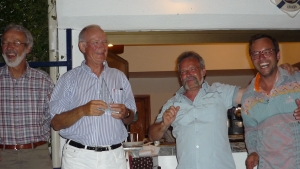 rechtzeitig zum Start der Nachmittagsregatta wieder in Selimiye an. Nach dem Start im Ausgang der Bucht von Selimiye war ein Segelslalom zwischen den vorgelagerten Inseln angesagt. Hier war die Qual der Wahl zwischen weiten Kreuzschlägen hinaus in den Hisarönü-Golf oder kurz-kurz entlang der Inseln. Der Wind draußen war stabiler und nicht den Abdeckungen unterworfen, so daß sich die längeren Schläge als besser erwiesen. Wieder zurück in Dirsek wurde schon fleißig gebadet. Der Höhepunkt des Abends war natürlich die Tombola, bei der ja bekanntlich jeder gewinnt. Beim nachfolgenden großen Tauschen der Gewinne konnte hoffentlich jeder das Gewünschte ergattern. Auch hier wurde anschließend, vor allem durch die Lockerheit unserer englischen Segelfreunde bis spät in die Nacht das Tanzbein geschwungen. | |