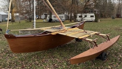 Zusatzinfo: Vaka 7,00 m, Ama 3,50 m, Breite über alles 3,33 m. Bauweise: Stripplanking mit Verglasung innen und außen. Das Boot ist segelklar!