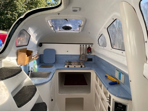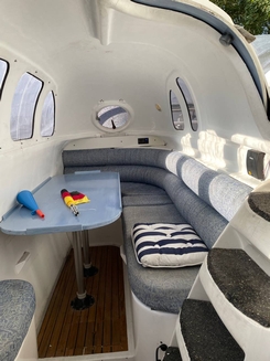 Im Backbord-Rumpf (Stehhöhe) Kombüse, Tisch und Sitzgelegenheit für fünf Personen, oder umzunutzen für eine Doppel-Koje