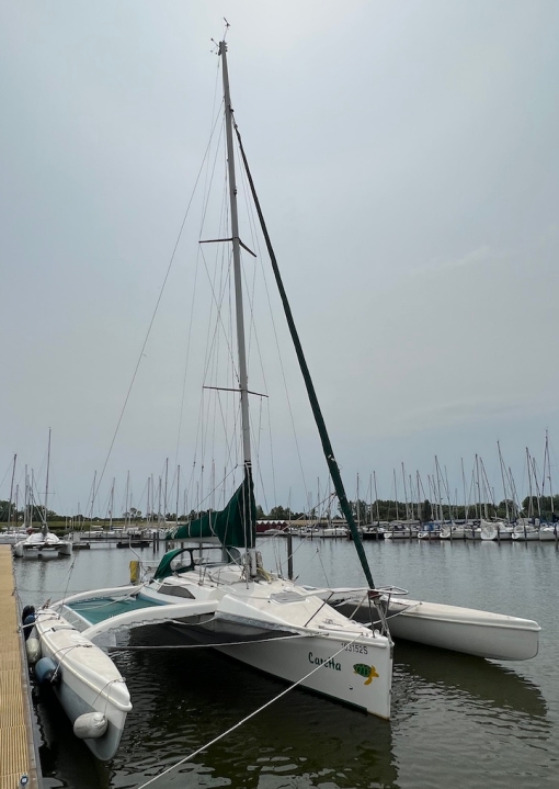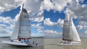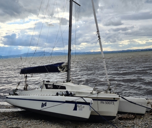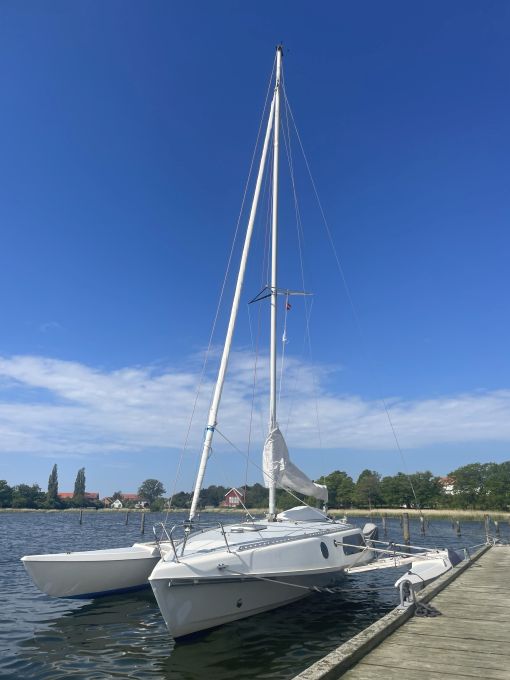 Stabil, schnell und leicht segelnder Daysailer von Virus-Boats Fr, Bj. 2006 (neues Modell mit vereinfachtem Trailern ohne Demontage der Schwimmer), einfaches Slippen durch Knicktrailer. Umfangreiche Ausrüstung für Touren, auch einhand. Gennaker wie neu, Segel gut. > > Anbieteradresse (Anzeige vom 05.2025) CLOU 10