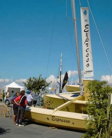 Für Expresso hat er die Option eines zentralen Cockpits gewählt. Eine Lösung, die erlaubt, den traditionellen Schwachpunkt des Trimarans - hinsichtlich der Absegnung des Layouts - im Handumdrehen zu vergessen. Am Beispiel Tremolino, Pionier in diesem Bereich, bietet Expresso seinen Besitzern bzw. der Crew ein langes Cockpit (zwei Meter zwischen den zwei crossbeams) auf zwei Sitzduchten an, natürlich verlängert durch die Seitentrampoline. Mit Blick auf die Schwimmer setzt sich die Ähnlichkeit zum Tremolino fort, denn sie sind - ebenso wie der zentrale Rumpf - lang und sperrig. Zwei komfortable Liegeplätze konnten im Rumpf untergebracht werden; der eine im Bugbereich und der andere am hinteren Teil. Im allgemeinen ein Konzept, das selbstverständlich mehr dem eines day-boats als dem des wahren Kreuzers gerecht wird. Man geht kaum Risiken ein, indem man diesem Schiffstyp eine größere Popularität in den sonnenverwöhnten Regionen vorhersagt, anstatt einer Verbreitung im Nebel des Nordens. Vor Anker oder am Steg kann man das Cockpit in einem ausgedehnten doppelten Liegeplatz umwandeln, welcher durch ein Zelt geschützt werden kann, das das Cockpit bis zu den gangboards eindeckt.