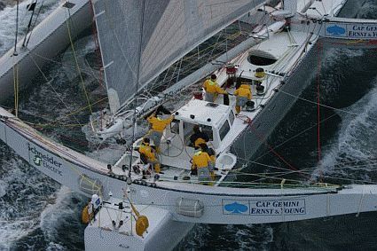 (24.03.04) Jules-Vernes-Trophy: Am 26. Tag seines Rekordversuches hat der große Trimaran GERONIMO Cape Leeuwin an der Südwestspitze Australiens passiert. Sein Zeitvorsprung hat sich mittlererweile auf komfortable 1.245 Seemeilen erhöht. Die kann er auch gut brauchen, denn im Moment quält sich die Crew bei 9 Knoten Wind in den "Roaring Forties" über den spiegelglatten Ententeich des südpolaren Meeres. Allerdings geht es dem Konkurrenten CHEYENNE auch nicht viel besser. Er konnte in "seinem" Tiefdruckgebiet vor Brasilien nur schlappe 234 Seemeilen in den letzten 24 Stunden zurücklegen. Damit steht er am Ende seines 46. Tages auf See 893 Seemeilen in Front des alten Rekordes. Es bleibt also spannend, vor allem weil beide Multis im Moment vor irgendwelchen Schäden verschont geblieben sind. Arbeit an GERONIMOS Vorsegel