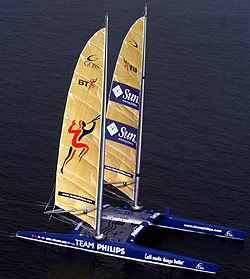 ... bzw. nur ein 40 ft langes Rumpfstück des 120 ft langen Bootes, dass in Island geborgen wurde. Die "Team Philips" wurde speziell für "The Race" gebaut und wurde im Dezember 2000 im Sturm aufgegeben. Trotz 70 Knoten Wind und 10 Meter hohen Wellen konnten Pete Goss und seine Crew abgeborgen werden.