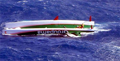 Groupama 3 gestern um 23:43 UT vor Neuseeland gekentert, alle Segler wohlauf und abgeborgen. Originaltext von Bord, Franck Cammas: