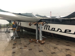 Der Multi 70 "Maserati" wurde am 19. August auf dem Werftgelände von einer Sturmböe von den Lagerböcken geworfen und beschädigt.