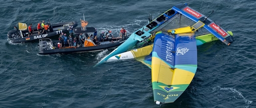 Totalschaden von Brasilien beim SailGP-Training in Sassnitz. Glücklicherweise wird niemand verletzt.