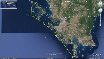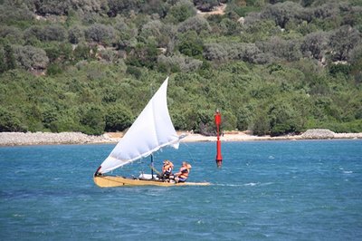 And onward we ploughed, but this time I took care, to ease the sheet at the impact of the steepest waves, to take some pressure off the bow at that moment. Shurely there was still a lot of water flying, and Olli,when hit the second time like a punching ball, shouted " Thank you!" But he was smiling, the sun was shining, and although the water was warm, it wasn' t filling our boat like a bathtub anymore.