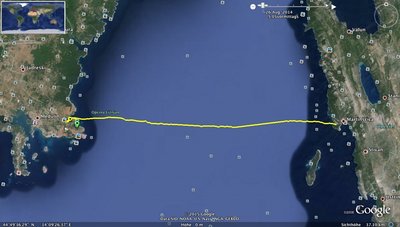 The drainer was gargling along merrily, and Olli, crouched on the outrigger, started to soak after the first few hits. I had told him,that the dryest job on board was to hike out on the outrigger, but his wet clothes were only hiking (sic) rain gear, so he didn' t stay dry very long after all. But the water had 24 degrees, the sun was shining, and he didn' t seem to be concerned at all, though it was rather his first time. The only other time he had been sailing, had been with me , on the bavarian "Chiemsee". So he didn' t knew any better, and the only one around with accelerated heartbeat was me. To be out on the sea, at the beginning of a "big " voyage, allone with the wind and the waves, on such a small boat, that is really something!