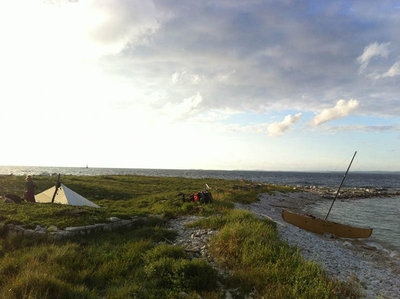 At 14:00, south of Pula, the hunger let us drop the sail and screw out the floor hatches of the vaka, in search of the food bag. We lunched on the drift and soon continued our south southeasterly course, sometimes using the paddle very lazyly to add a knot, when boatspeed dropped below 3. We started to scan the islands, we passed for a beaching spot at 18:00, but it was only one hour later, when we had rounded the last island of Istria, south of the southermost tip of the peninsula, that we found a gentle slope of shere rock, that allowed us to land on the island of Fenoliga , after 18 miles of sailing. We had encountered an astonishing counter current of about 2 knots between the cape and the island, and that`s perhaps the reason, which made us pull the boat extra high up the dry. Also we had landed on the eastern shore and my "Windfinder SMS" foretold a change to force 5 to 6 out of the noth east during the night and the next day. And that' s why we chose a windsheltered place on the westshore for sleeping, where we cooked our evening meal: Dry soup- alas! But we improved it with some noodles and herbs, we still had left. But what we lacked totally by now, was beer. Only one miserable tin cup of wine helped us gulp down the soup. As predicted, the wind started to change and get up after midnight, and in the early morning we were even awakened by a few drops of rain. We hadn' t bothered to put up the tent, but quickly covered ourselves with the unbuilt tent and a plastic sheet, and thus were able to sleep on, till the sky was blue again!