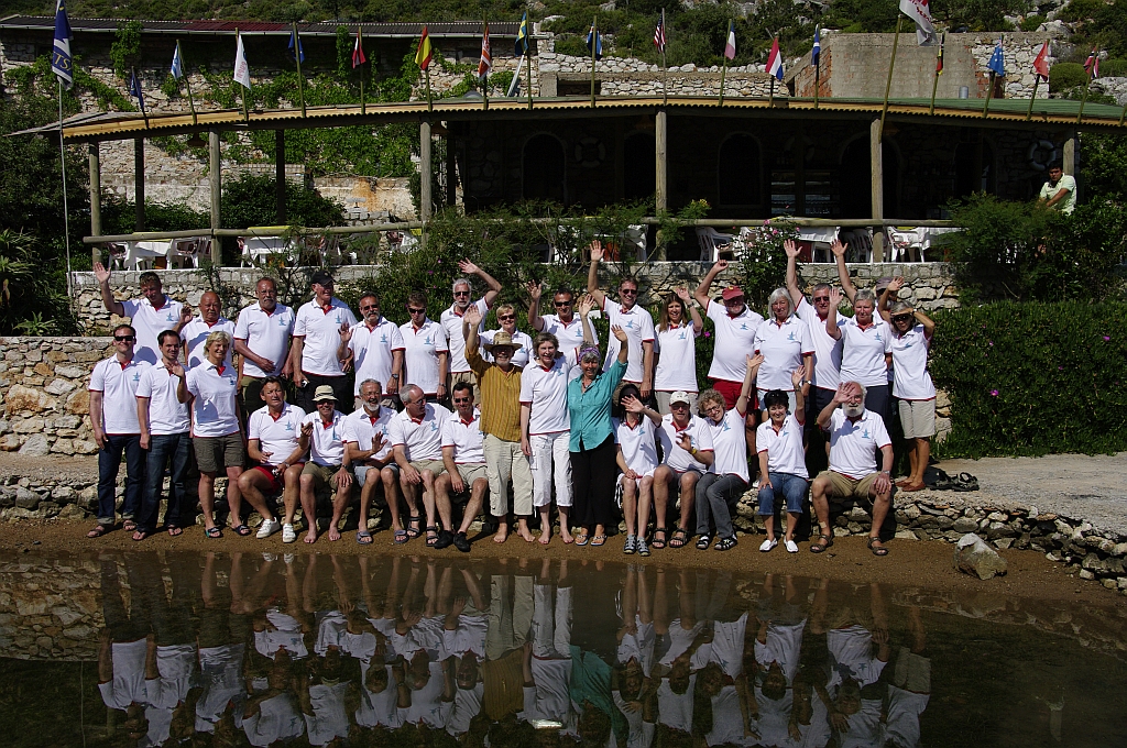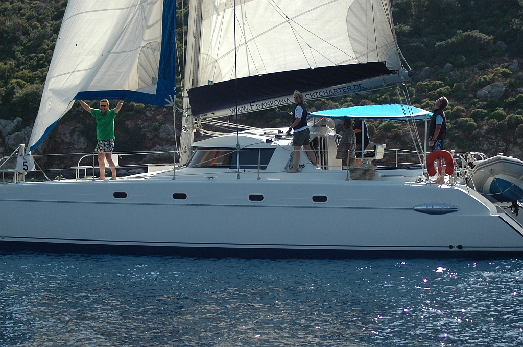 Einzig die Outremer "Come Beck" konnte mit der leichten Morgenbrise vor der Flaute davonsegeln und kam mit über einer Stunde Vorsprung ins Ziel. Der Rest der Flotte sammelte sich dümpelnd bei der Untiefenmarke vor Kap Atabol. Aber kaum waren die ersten Gedanken an einen Abbruch aufgekommen, besann sich der Wind doch noch und alle Boote kamen unter Segel nach Dirsek. Dort gab es die ersten Sprünge ins Wasser, das schon brauchbare Temperaturen aufwies. |