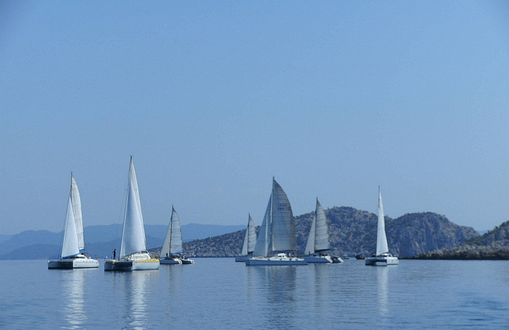 Aufgrund der Erfahrungen mit dem spät auffrischen Wind wurde erst um 11:00 Uhr gestartet. Und so stellte sich auch bald eine leichte Brise ein, die das Regattafeld quer über den Golf von Hisarönü brachte. Vor der Bencik- Bucht mußten die roten Felsen von Dislice gerundet werden. Weiter ging es um die Inseln Koca und Kameriye in die Einfahrt zur Bucht von Selimiye. |