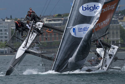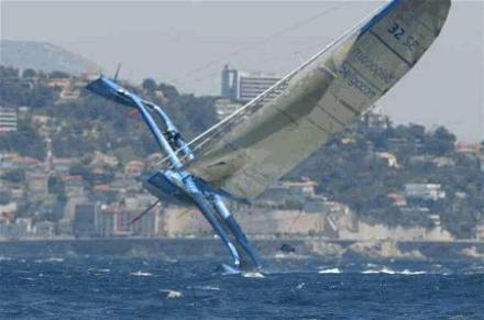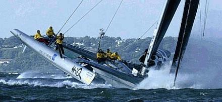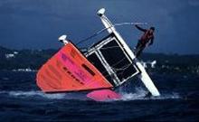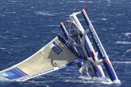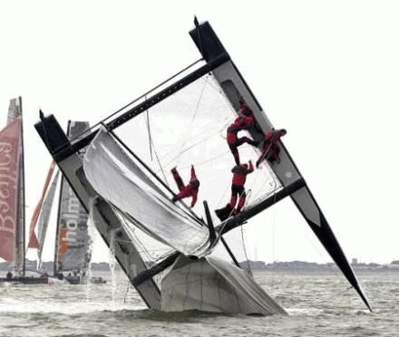 Multihull-KenterungenSpektakuläre Bilder, die zeigen, was bei extremen Multihulldesigns und extremer Fahrweise passieren kann. Speziell Renntrimarane, die Längen-Breitenverhältnisse von 1:1 aufweisen, neigen durch mangelnde Längsstabilität dazu über die Büge zu kentern.