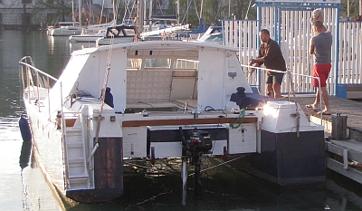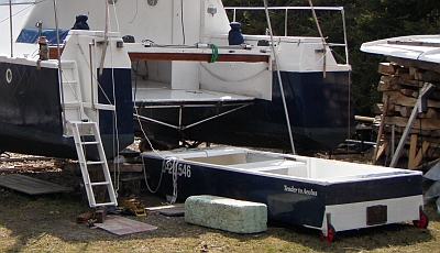 Das Beiboot wird im zusammengeschobenen Zustand quer zwischen den Rümpfen an den Davids oder ähnlichem hochgezogen. Das Projekt soll auf keinen Fall eine Hi-Tech Flunder, aufwendig und mit hohem Kostenaufwand werden.