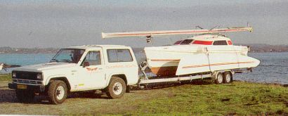 Es gibt die Kategorie der trailerbaren Tris. Sie sind sehr verbreitet und verfügen über eine ausgezeichnete Serienreife. Die Ausleger können nach innen geschwungen oder angeklapt werden. Das hilft nicht nur im Hafen sonder auch beim Trailern. Einige erreichen angeklapt die erlaubte Straßenbreite. Auf diese Weise muß nur der Mast gelegt oder gestellt werden und schon geht es auf den Anhänger oder aufs Wasser. Mit so einem Teil kann man mal am Wochenende zur See fahren. Bei den Tris, die die Straßenbreite nicht erreichen, müssen die Ausleger demontiert werden. Das ist ein erträglicher mehr Aufwand. Der Anhänger kann passend zum Boot gekauft werden, was alles leichter macht. Hinzu kommt, dass das Boot auch mit dem Straßenanhänger geslipt werden kann.
